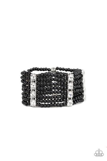 Held together by stacked white rhinestone encrusted frames, a collection of dainty black beads are threaded along stretchy bands around the wrist for a timeless twist.