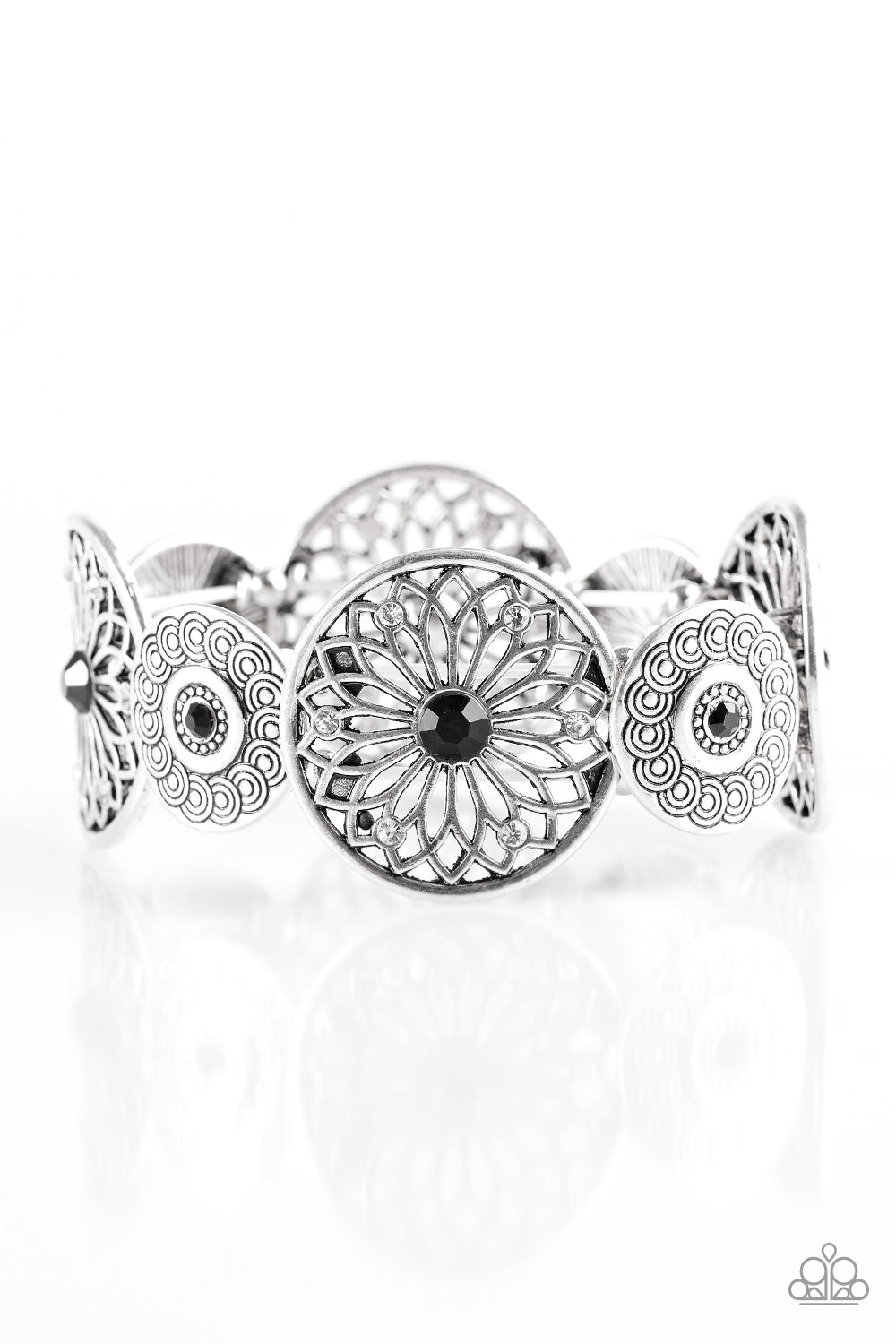 Dotted in glittery black rhinestone centers, mismatched silver frames are threaded along elastic stretchy bands, creating a decorative shimmer around the wrist.