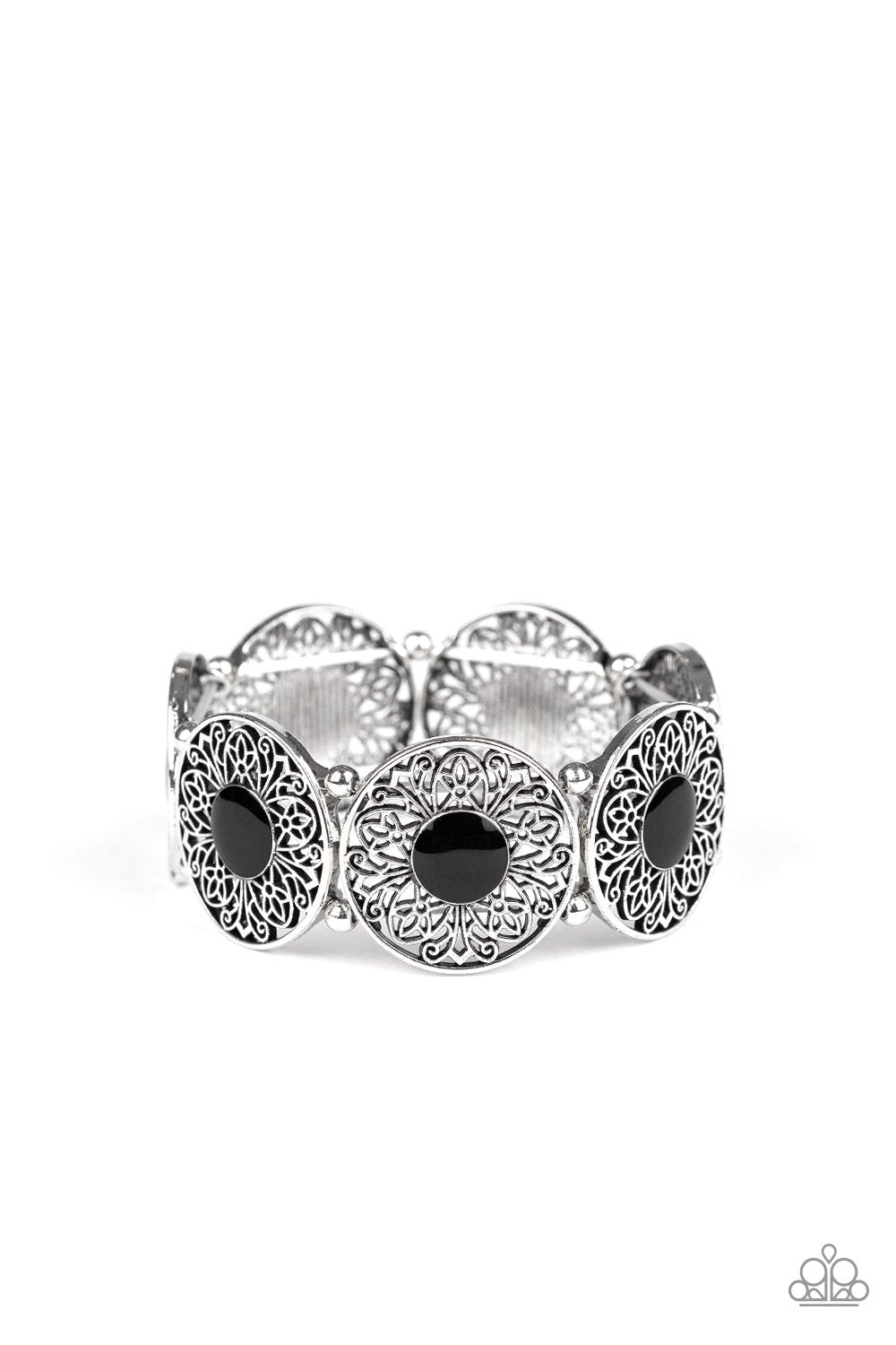 Frilly silver petals bloom from a painted black center, creating a colorful flower. Infused with dainty silver beads, the shiny flower frames are threaded along stretchy bands around the wrist for a whimsical look.
