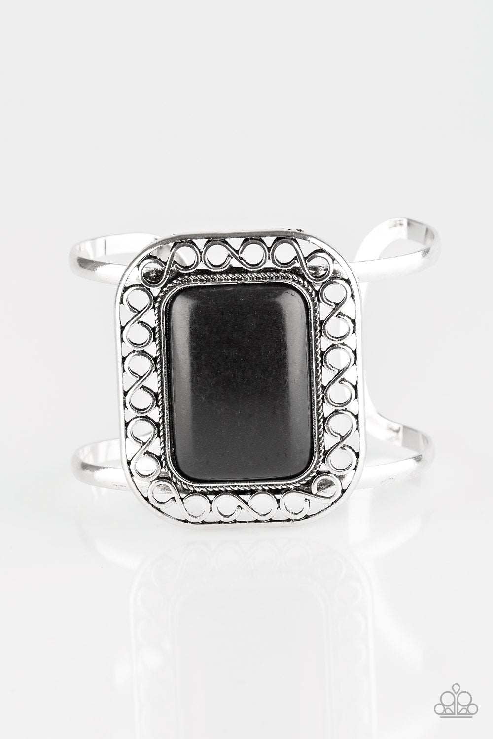 Chiseled into a tranquil rectangle, a smooth black stone is pressed into a shimmery silver frame swirling with texture for an artisan-inspired look. The earthy frame sits atop an airy silver cuff, creating a seasonal centerpiece.