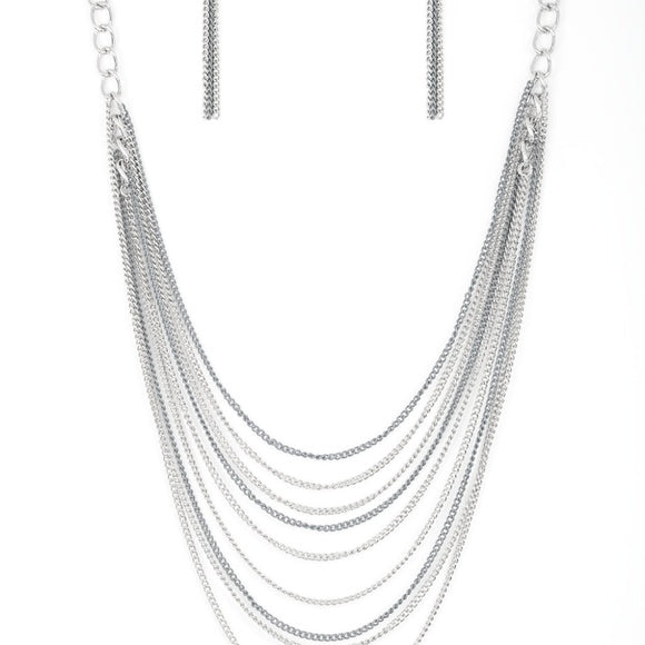 Strands of bold silver links give way to rows of shimmery silver and shiny black chains, creating colorful layers down the chest. Features an adjustable clasp closure.