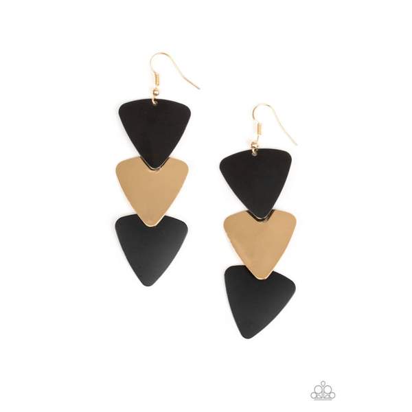 Brushed in a high-sheen shimmer, glistening black and gold triangular frames cascade from the ear, creating an edgy lure. Earring attaches to a standard fishhook fitting.