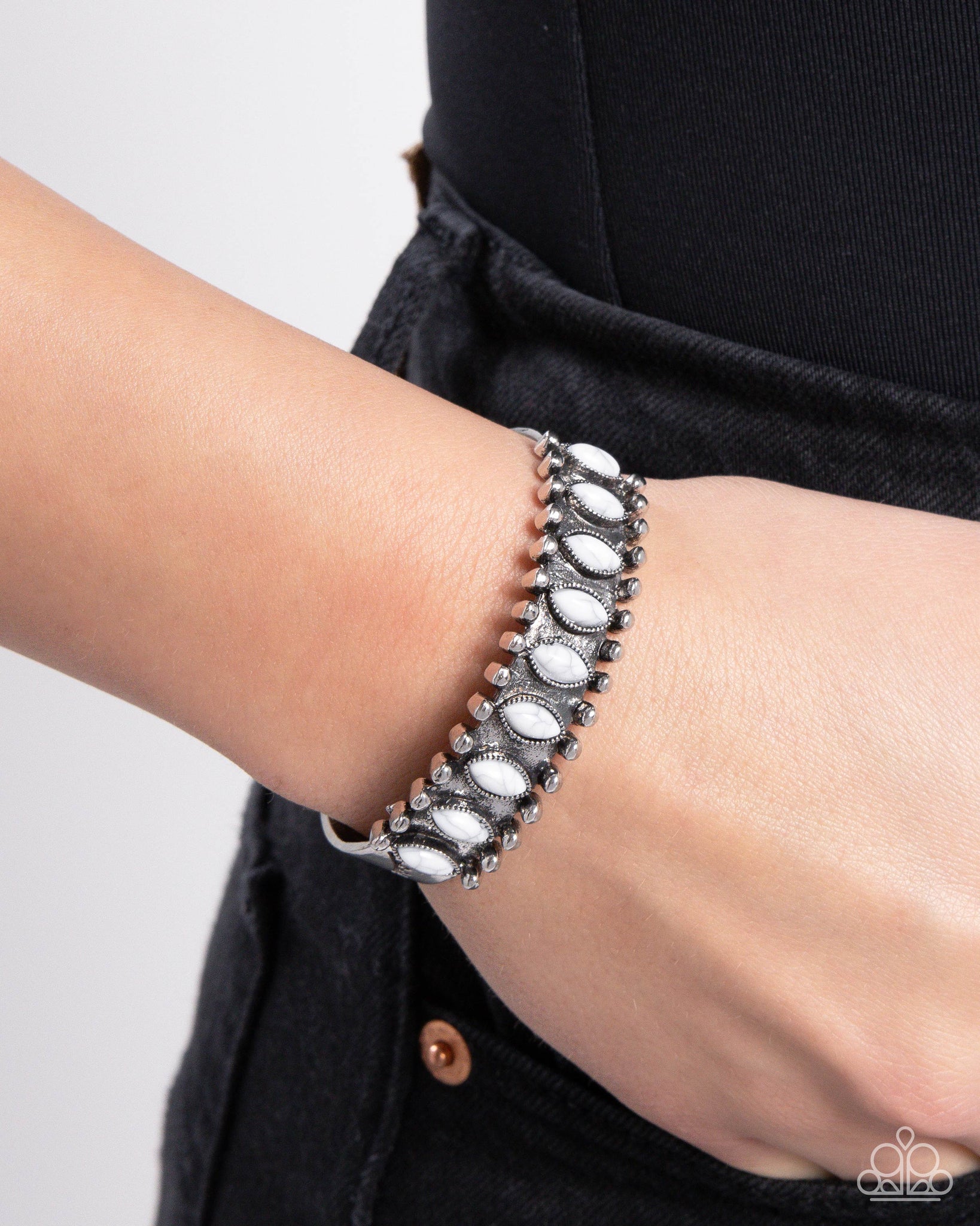 Pressed in dainty silver-studded frames, a row of tranquil marquise-cut white stones line the center of a studded, antiqued silver cuff for a sassy Southwestern look. As the stone elements in this piece are natural, some color variation is normal.