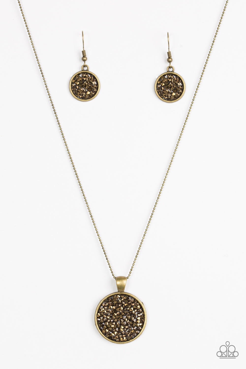 Glittery aurum and topaz rhinestones are sprinkled along a round brass frame, creating a dramatic pendant below the collar for a glamorous look. Features an adjustable clasp closure.