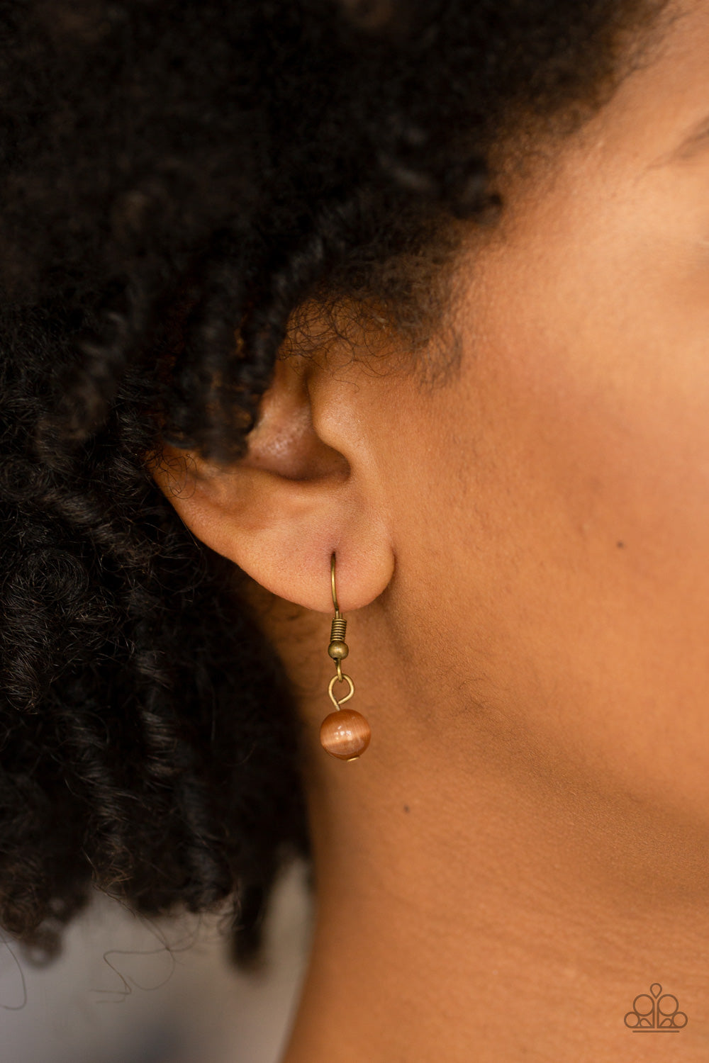 Infused with a topaz rhinestone encrusted fitting, an asymmetrical brown moonstone swings from the bottom of an elongated brass chain for a whimsical look. Features an adjustable clasp closure.