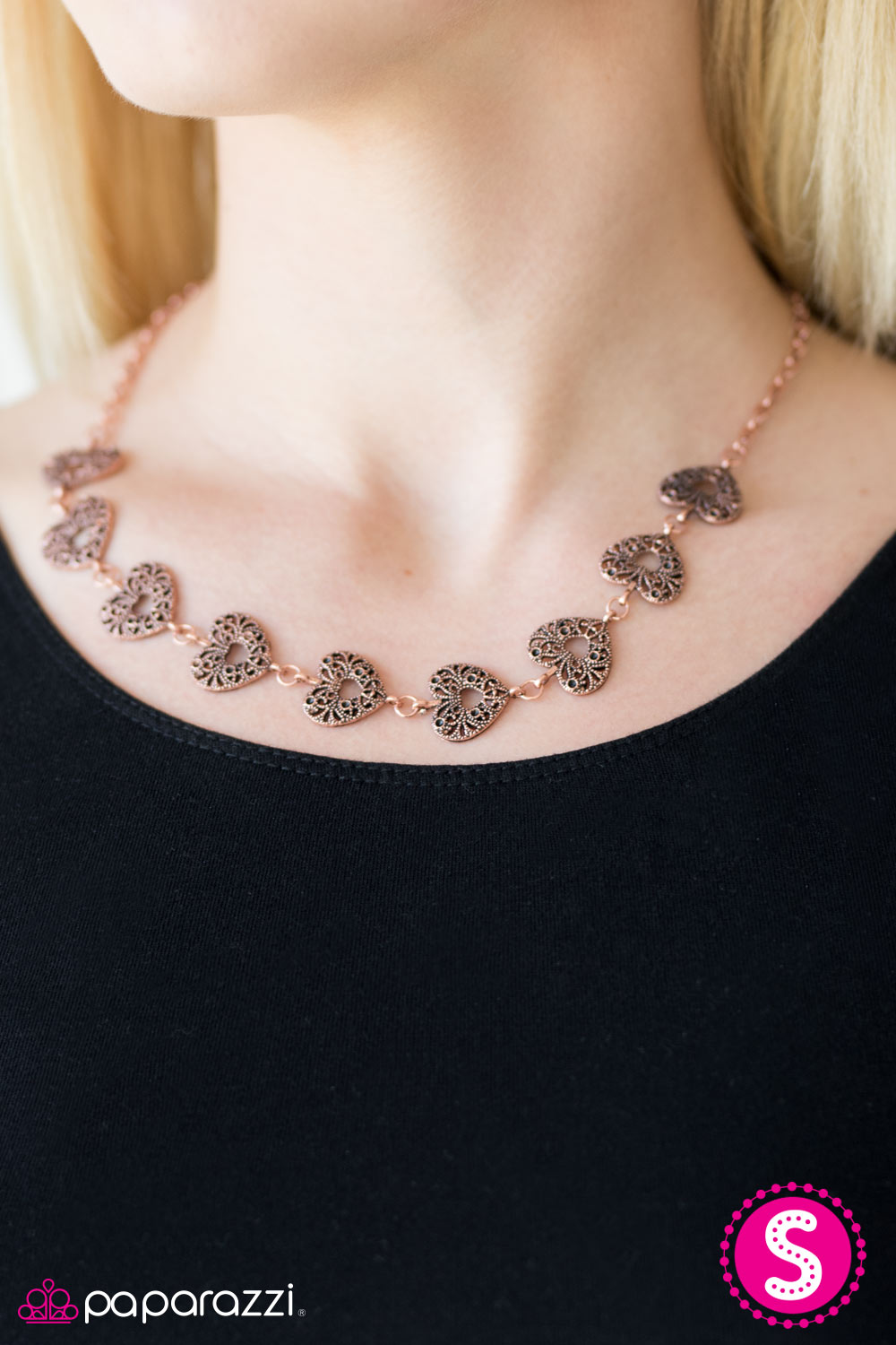 Vintage inspired heart frames link below the collar, creating a whimsical chain. Brushed in an antiqued finish, shiny filigree delicately climbs the copper hearts for an ornate finish. Features an adjustable clasp closure.
