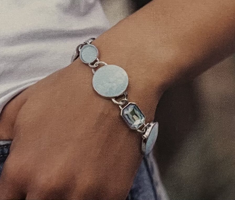 Sold only as a set which includes one of each accessory featured in the Glimpses of Malibu Trend Blend: a Necklace featuring the sweet pastel of Spun Sugar, sparkling blue gems combine with milky blue beads and alternate across the collar with oversized discs painted in blue enamel. The whimsically modern collection connects to a silver chain resulting in a charismatic display below the collar. Features an adjustable clasp closure. Includes one pair of matching earrings.