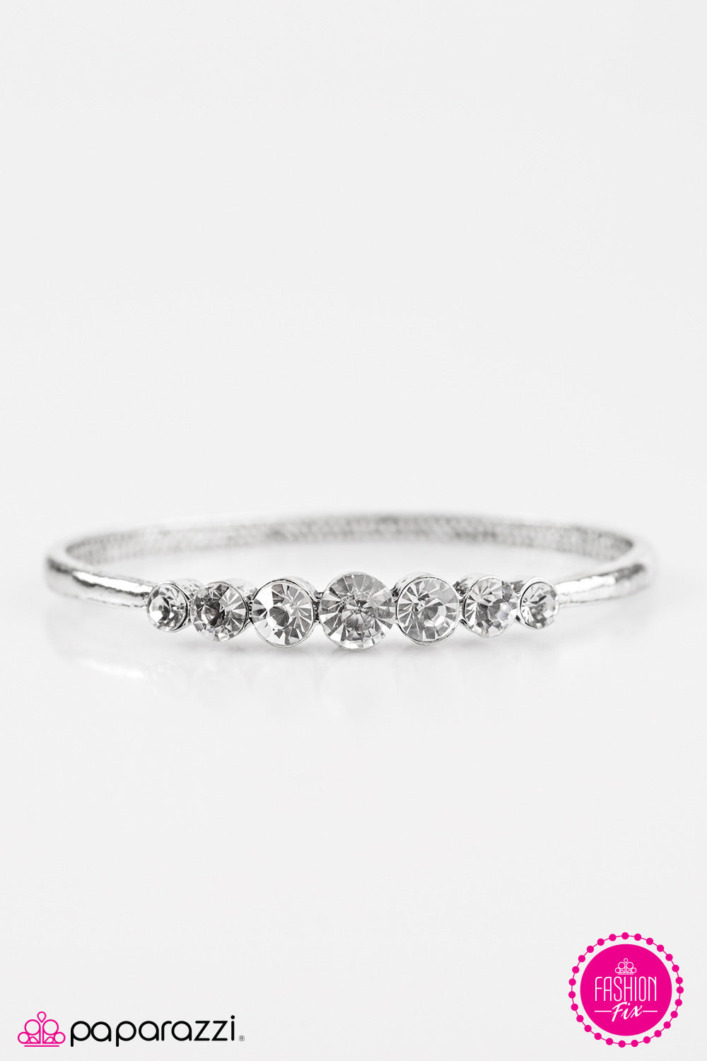 Glittery white rhinestones are sprinkled along the center of a glistening silver bangle, creating a dramatic centerpiece.