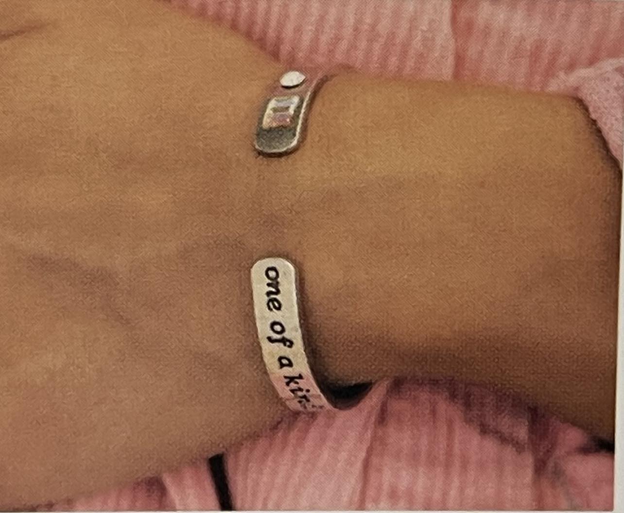 A Silver Cuff Bracelet with a minimalistic silver bar etched with the words, “one of a kind” on one end and embellished with a dainty rhinestone and pastel gems on the other, curves into a simple cuff around the wrist. A pair of Matching Earring
