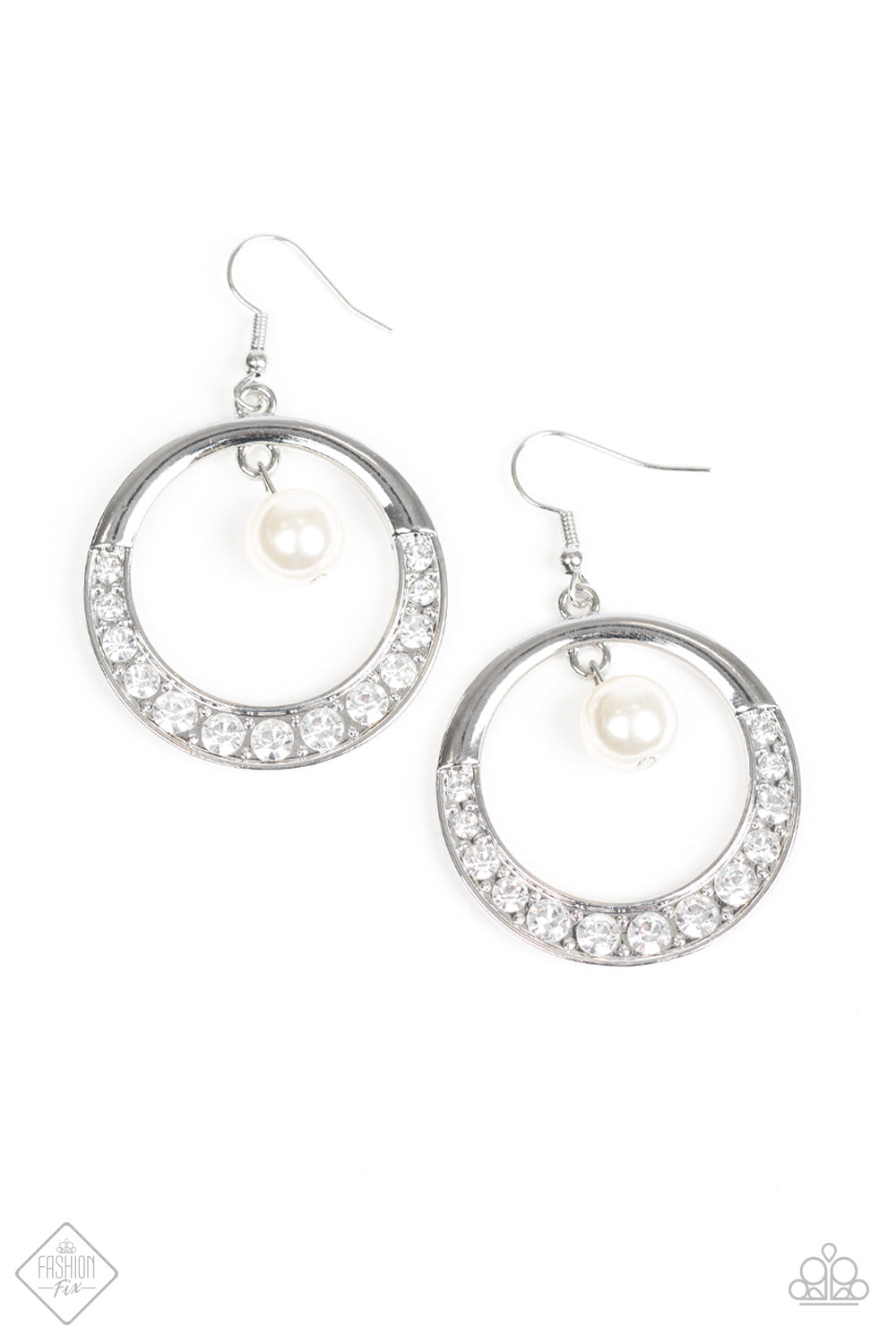 A single white pearl is suspended gracefully from the top of a shimmery silver hoop. Glittery white rhinestones sparkle along the bottom of the frame, gradually increasing in size as they reach the center for a glamorous finish. Earring attaches to a standard fishhook fitting. -$5.00