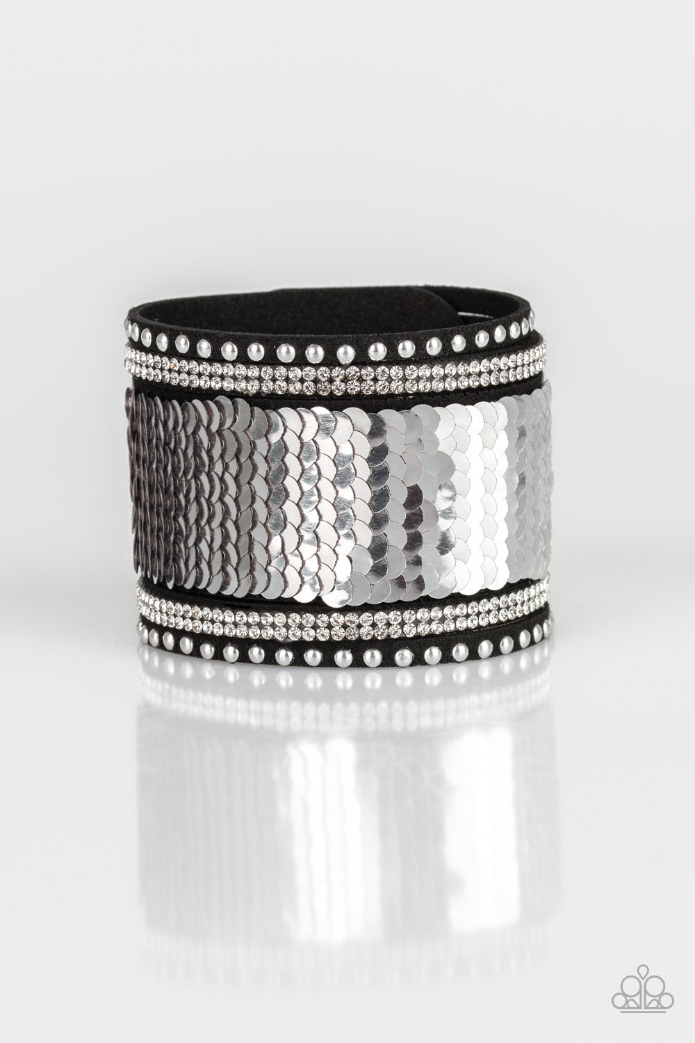 Infused with strands of blinding white rhinestones, row after row of shimmery sequins are stitched across the front of a spliced black suede band. Bracelet features reversible sequins that change from silver to rose gold