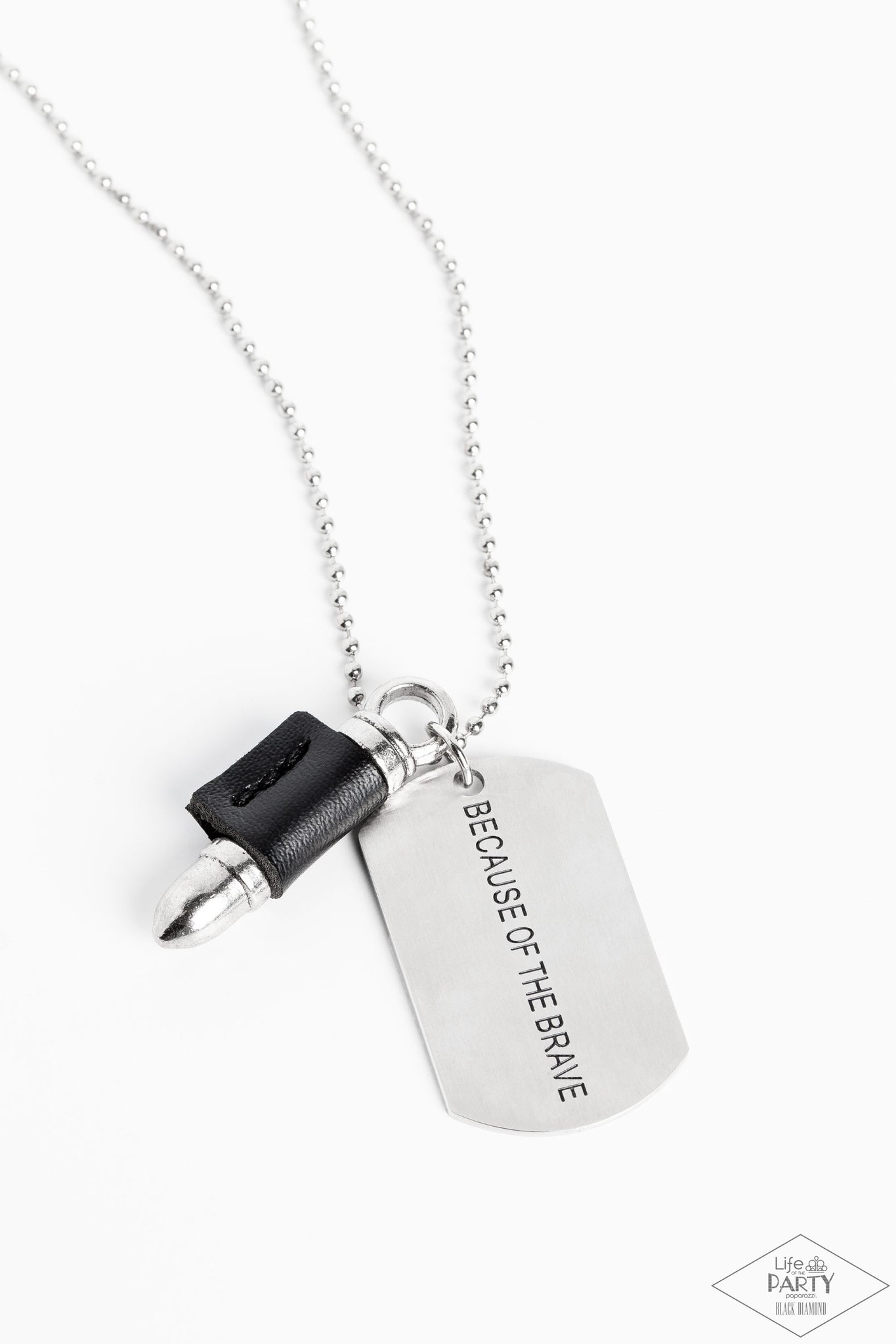 Pinched between a black leather fitting, a silver bullet pendant joins a silver dog tag at the bottom of a silver ball chain. The shimmery dog tag is stamped in the phrase, "Because of the Brave," for a patriotic finish. Features a ball and clasp closure.