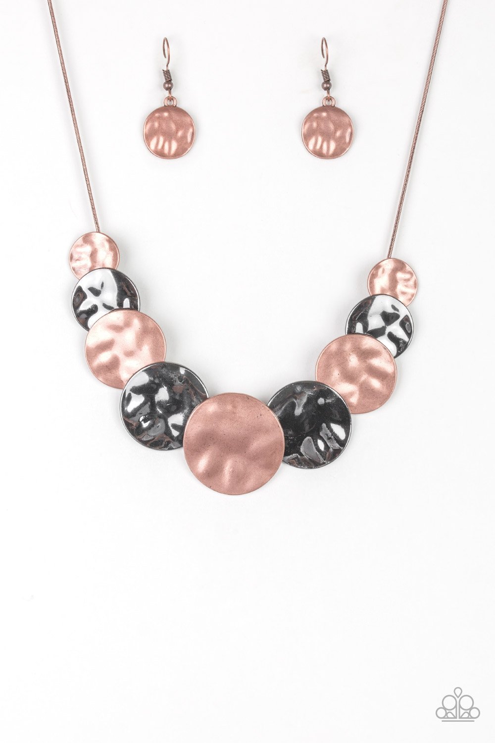 Gradually increasing in size near the center, hammered copper and gunmetal discs slide along a copper wire chain below the collar for an edgy look. Features an adjustable clasp closure.