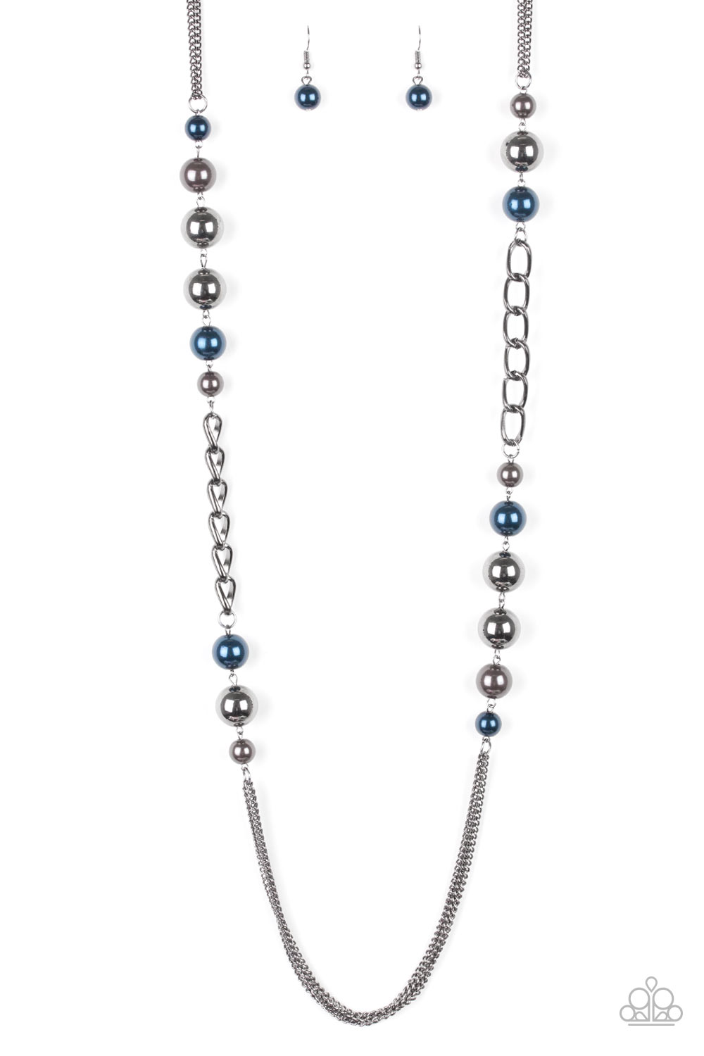 Varying in size, pearly blue and oversized gunmetal beads give way to sections of bold gunmetal chain. Layers of gunmetal chains drape across the bottom of the design for a flawless finish. Features an adjustable clasp closure.
