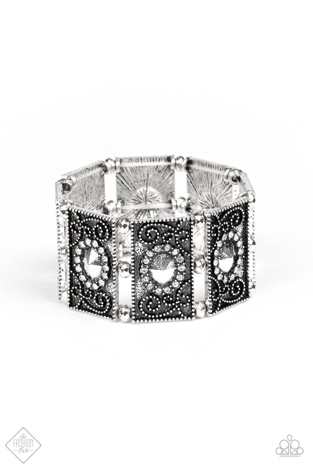 Silver beads encircled by rhinestones are nestled inside a row of three vintage frames that cascade down the chest at the bottom of an elongated silver chain. Glistening silver chains stream from the bottom of the stacked pendant, creating a gorgeously tapered tassel. Features an adjustable clasp closure.