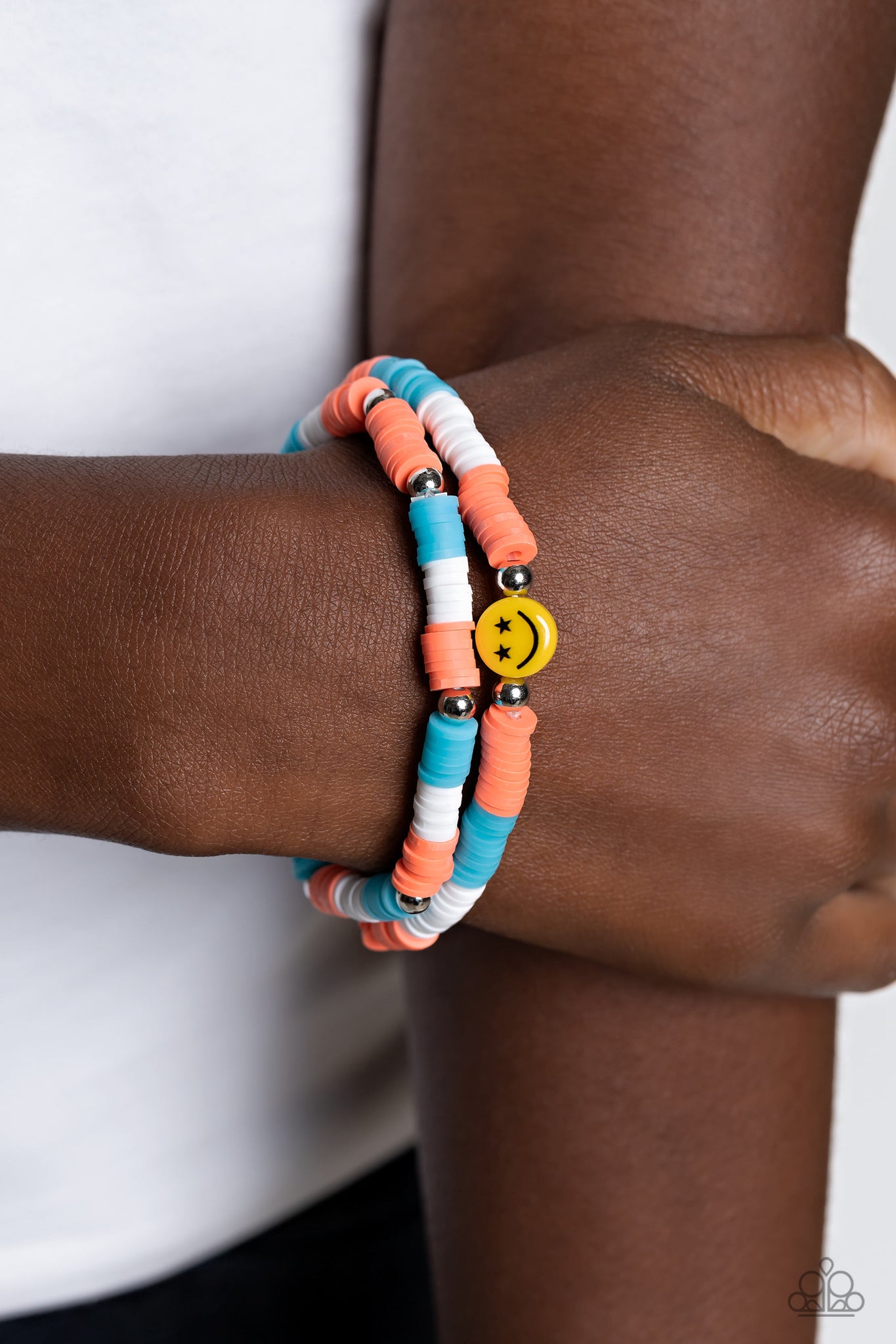 Coral, blue, and white rubber discs combine with sporadically placed silver beads to provide a vibrant pop of color along the wrist. Meeting in the center of one of the multi-shaded bracelets, a yellow bead with a smiley face, featuring stars for eyes, rests for a youthful finish.