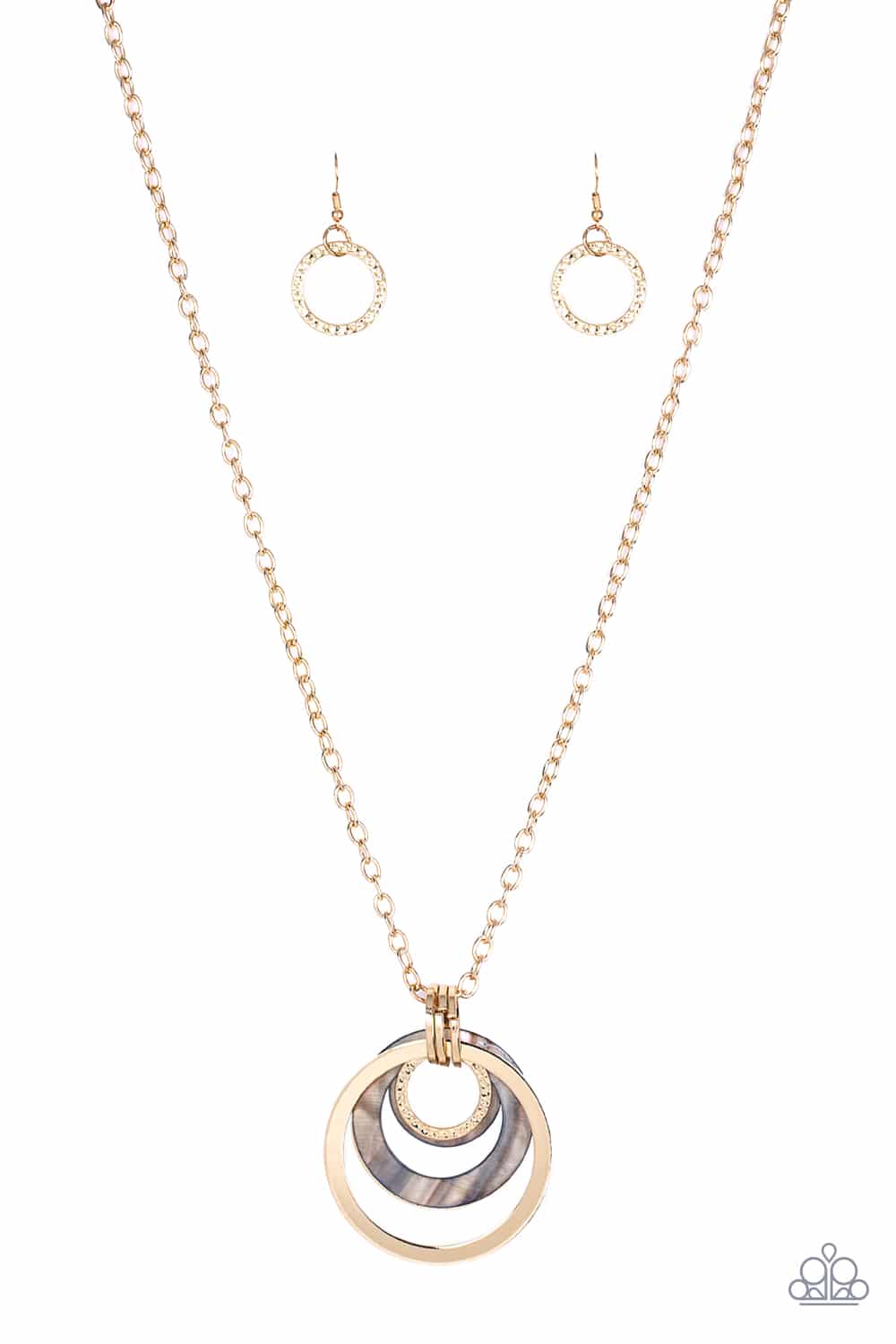 Brushed in an iridescent finish, shell-like hoops join mismatched gold hoops at the bottom of an elongated gold chain for a whimsical look. Features an adjustable clasp closure.