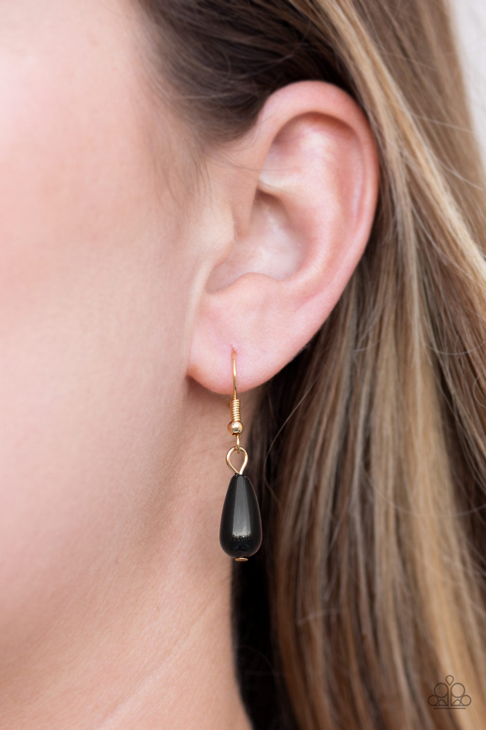 Shiny black teardrop beads swing from the tops of delicately hammered gold teardrop frames, creating a refined fringe below the collar. Features an adjustable clasp closure.
