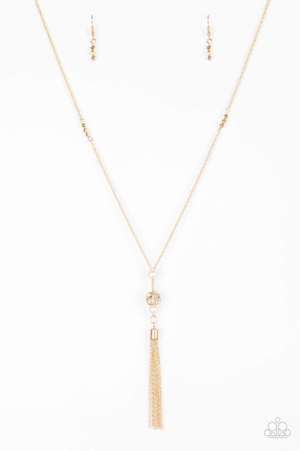 Infused with faceted gold beads, two pearly white beads flank a gold bead encrusted in glittery white rhinestones for a regal look. Features an adjustable clasp closure.