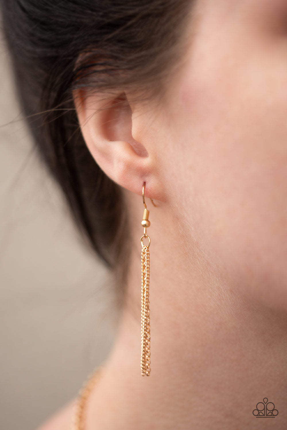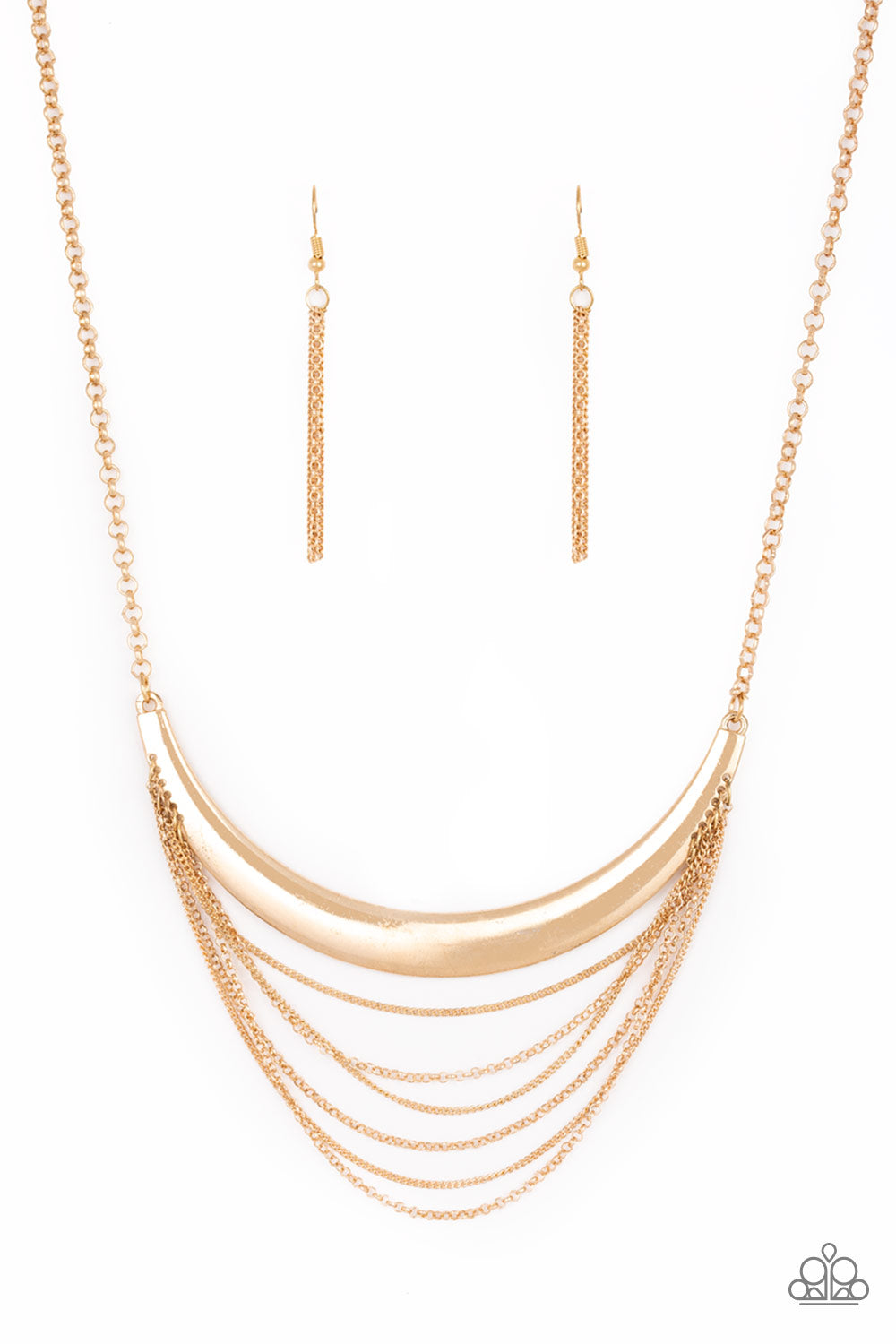 Rows of mismatched gold chains connect to a glistening gold crescent, creating horizontal layers down the chest for a wanderlust look. Features an adjustable clasp closure.