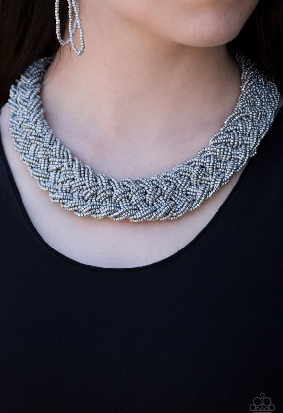 Brushed in a flashy shimmer, metallic seed beads braid into an indigenous braid below the collar for a seasonal look. Features an adjustable clasp closure.