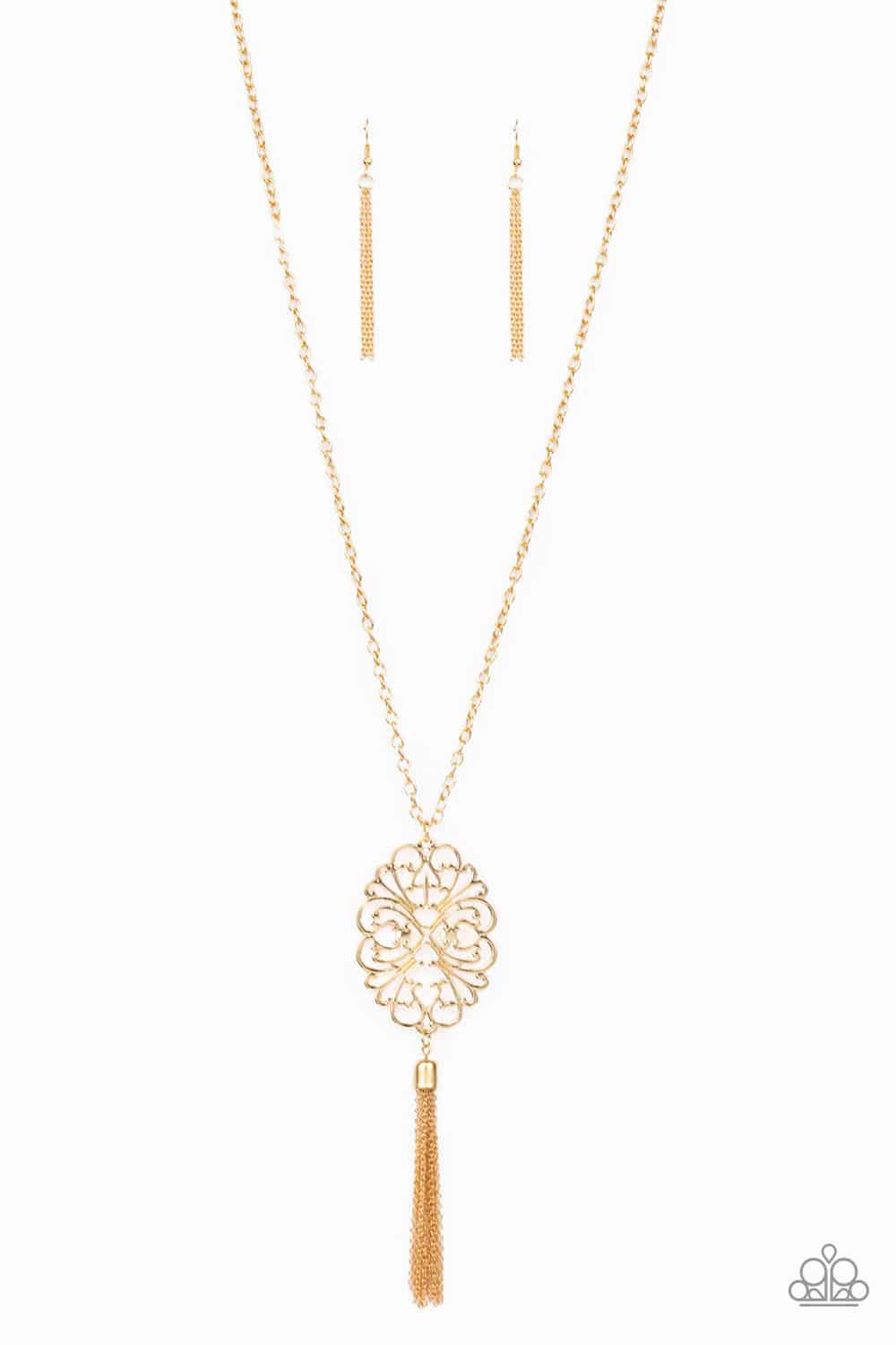 Swirling with filigree detail, a mandala-like pendant gives way to a glistening silver tassel at the end of a lengthened silver chain for a whimsical look. Features an adjustable clasp closure.