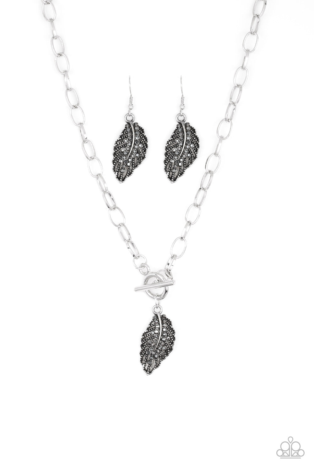 Glittery hematite rhinestones are sprinkled along a life-like silver feather pendant. The whimsical pendant swings from the bottom of a bulky silver chain below the collar for an edgy look. Features a toggle closure.