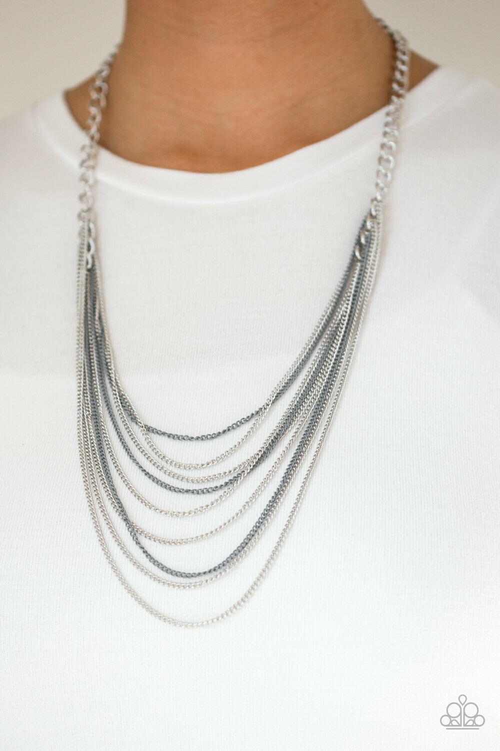 Strands of bold silver links give way to rows of shimmery silver and shiny gray chains, creating colorful layers down the chest. Features an adjustable clasp closure.