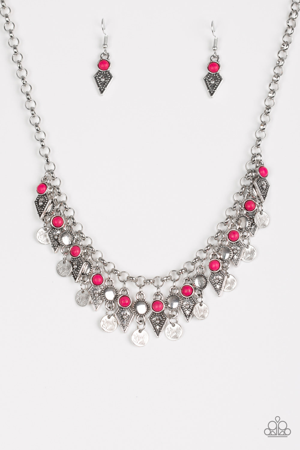 Featuring studded detail and vivacious pink stone accents, mismatched silver frames swing from the bottom of a bold silver chain, creating a flirty fringe below the collar. Features an adjustable clasp closure.