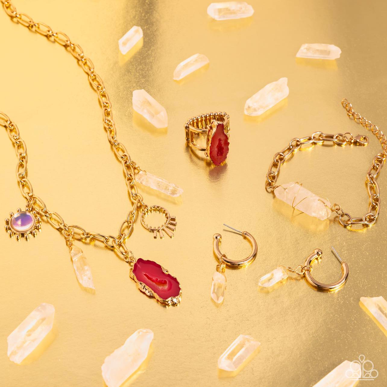 Sold only as a set which includes one of each accessory featured in the Simply Santa Fe Trend Blend: a Pink Necklace with a pair of matching earrings. (Gathering along a gold paperclip chain, a collection of whimsically earthy charms gather including an opalescent bead pressed in a gold studded frame, a gold studded ring with flared gold bars, a pink geode stone encased in gold, and chiseled pieces of white stone).