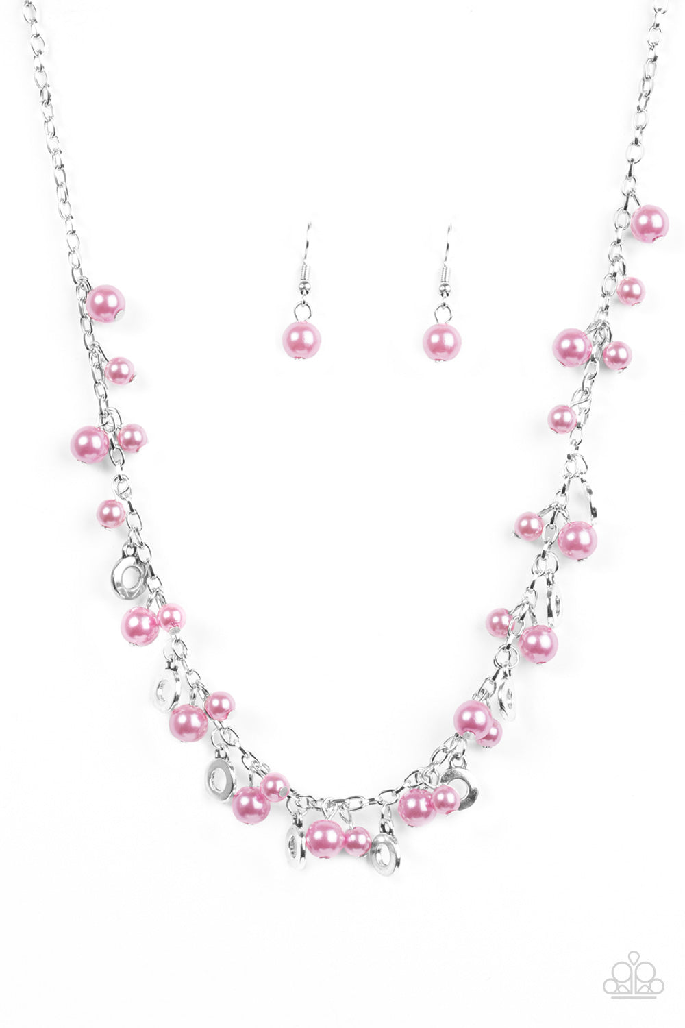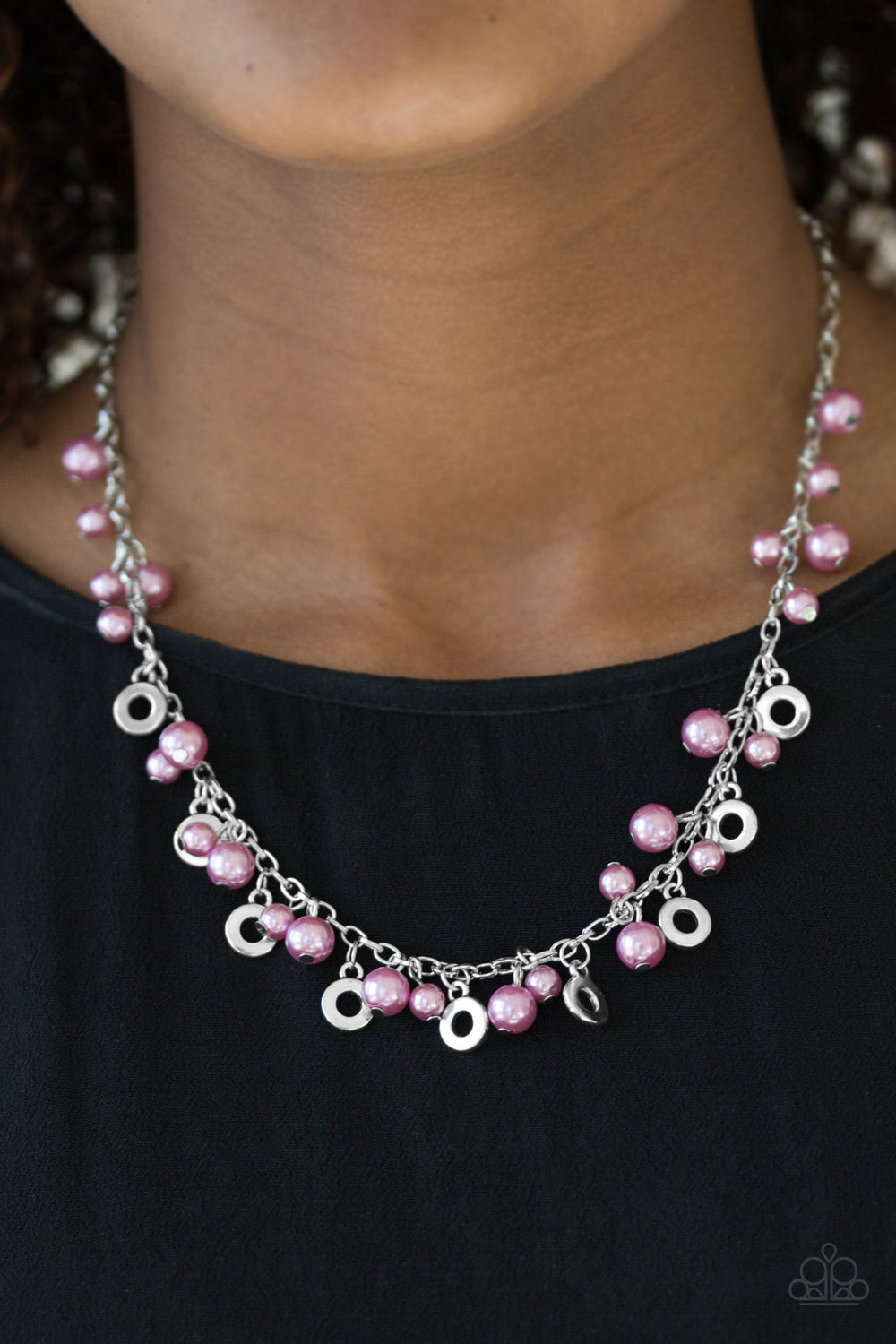 Varying in size, pearly purple beads trickle from the bottom of a shimmery silver chain. Airy silver discs trickle between the pearl accents, creating a refined fringe below the collar. Features an adjustable clasp closure.