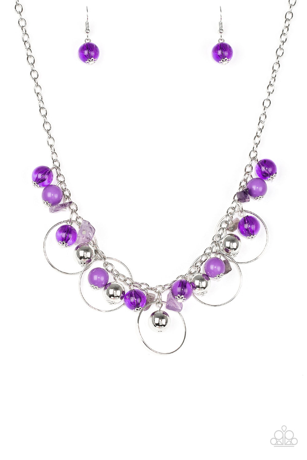 Glassy purple, polished purple, and classic silver chains swing from the bottom of a shimmery silver chain. Infused with large silver hoops, bits of vivacious purple rock beading trickle between the beaded accent, creating an earthy fringe below the collar. Features an adjustable clasp closure.