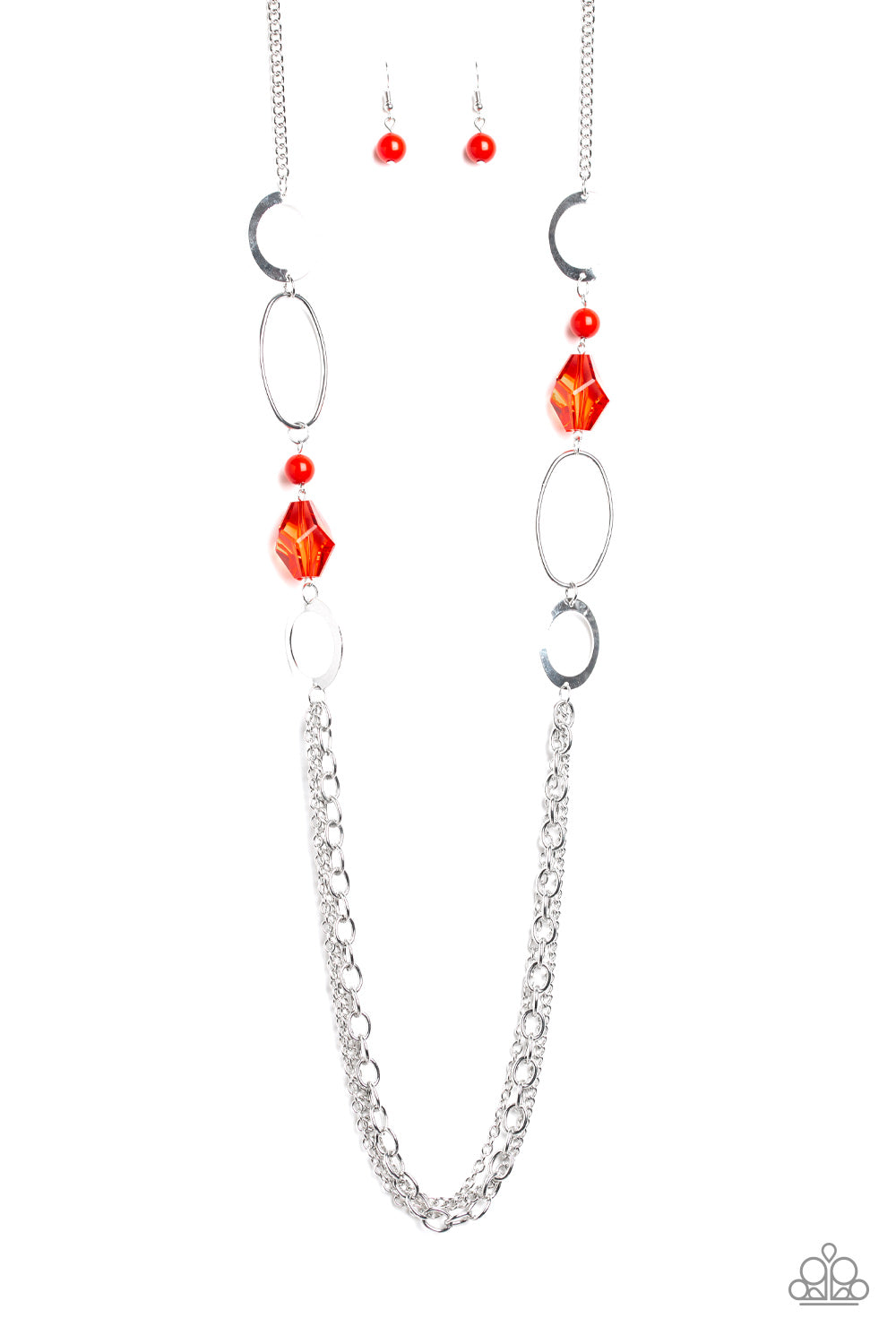 Featuring red crystal-like and dainty red beads, an array of shimmery silver hoops give way to layers of glistening silver chains across the chest for a classic look. Features an adjustable clasp closure.
