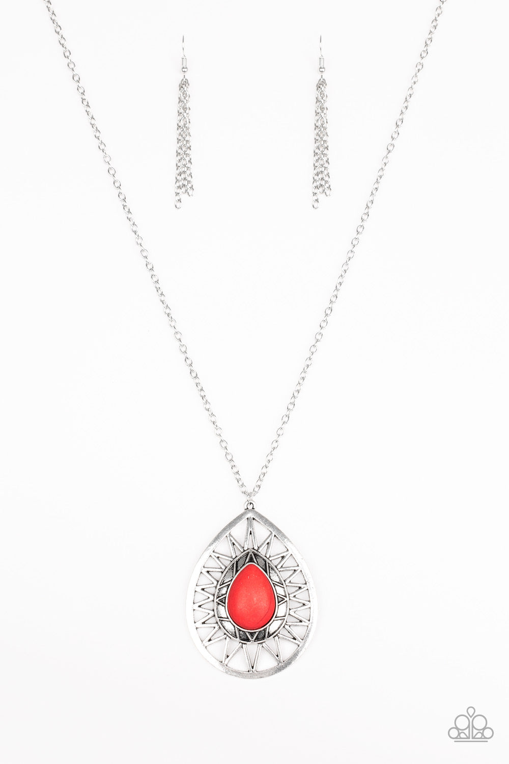 A fiery red stone is pressed into the center of a large silver teardrop radiating with shimmery sunburst patterns. The tribal in spired pendant swings from the bottom of a lengthened silver chain for a dramatic look. Features an adjustable clasp closure.