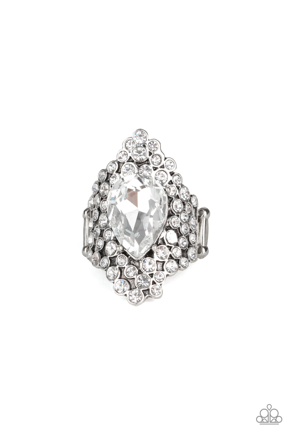Featuring a regal teardrop cut, a glittery white gem is pressed into the center of a sparkling backdrop of glassy white rhinestones, creating a blinding centerpiece atop the finger. Features a stretchy band for a flexible fit.