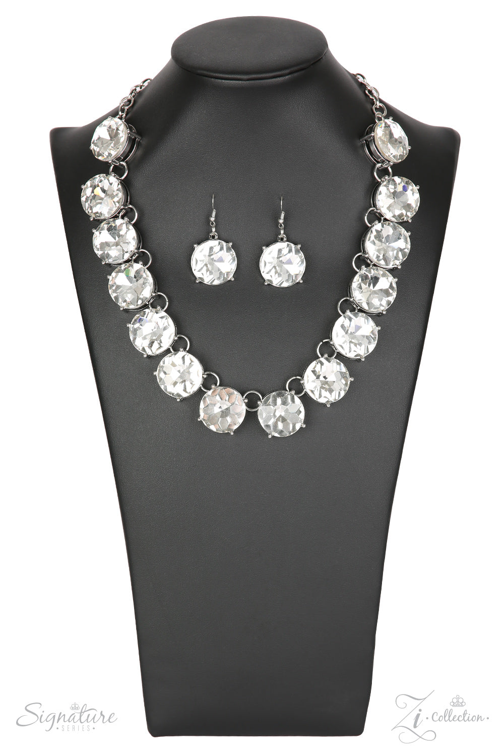 Dramatically over-sized rhinestones drip from the collar, bringing a modern twist to a classic concept. The quarter-sized rhinestones brilliantly catch and reflect the light, creating blinding sparkle that will leave a lasting impression. Features an adjustable clasp closure. Includes one pair of matching earrings.