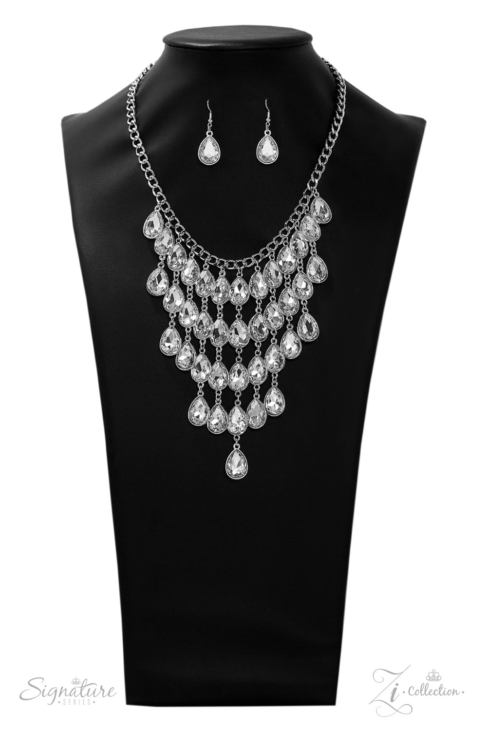 Glittery white gems are pressed into silver teardrop frames, creating a gorgeous tapered fringe below the collar as the sparkling drops link together in vertical rows of blinding shimmer. Features an adjustable clasp closure.