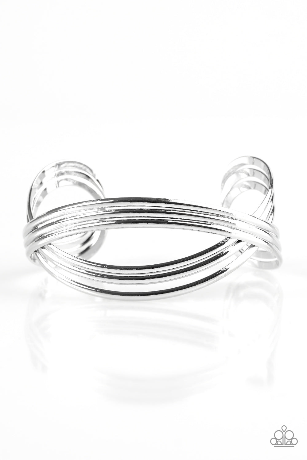 Glistening silver bars swoop across the wrist, coalescing into an airy cuff.