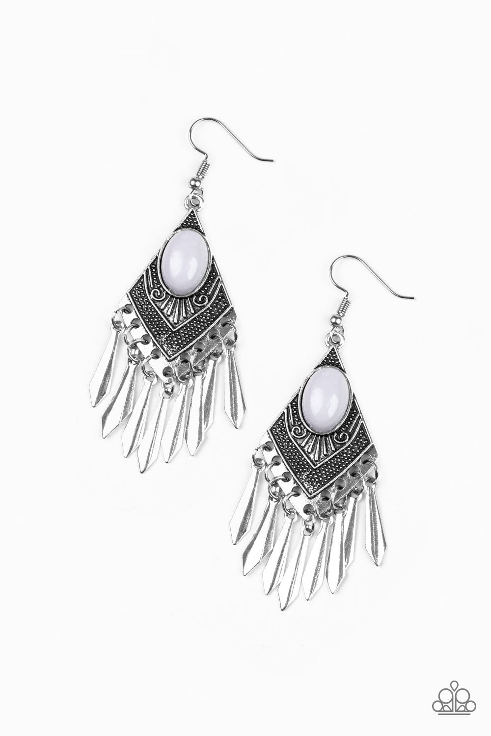 A polished gray bead is pressed into a diamond shaped frame radiating with tribal inspired details. Flared silver bars swing from the bottom of the ornate lure, creating a shiny fringe. Earring attaches to a standard fishhook fitting.