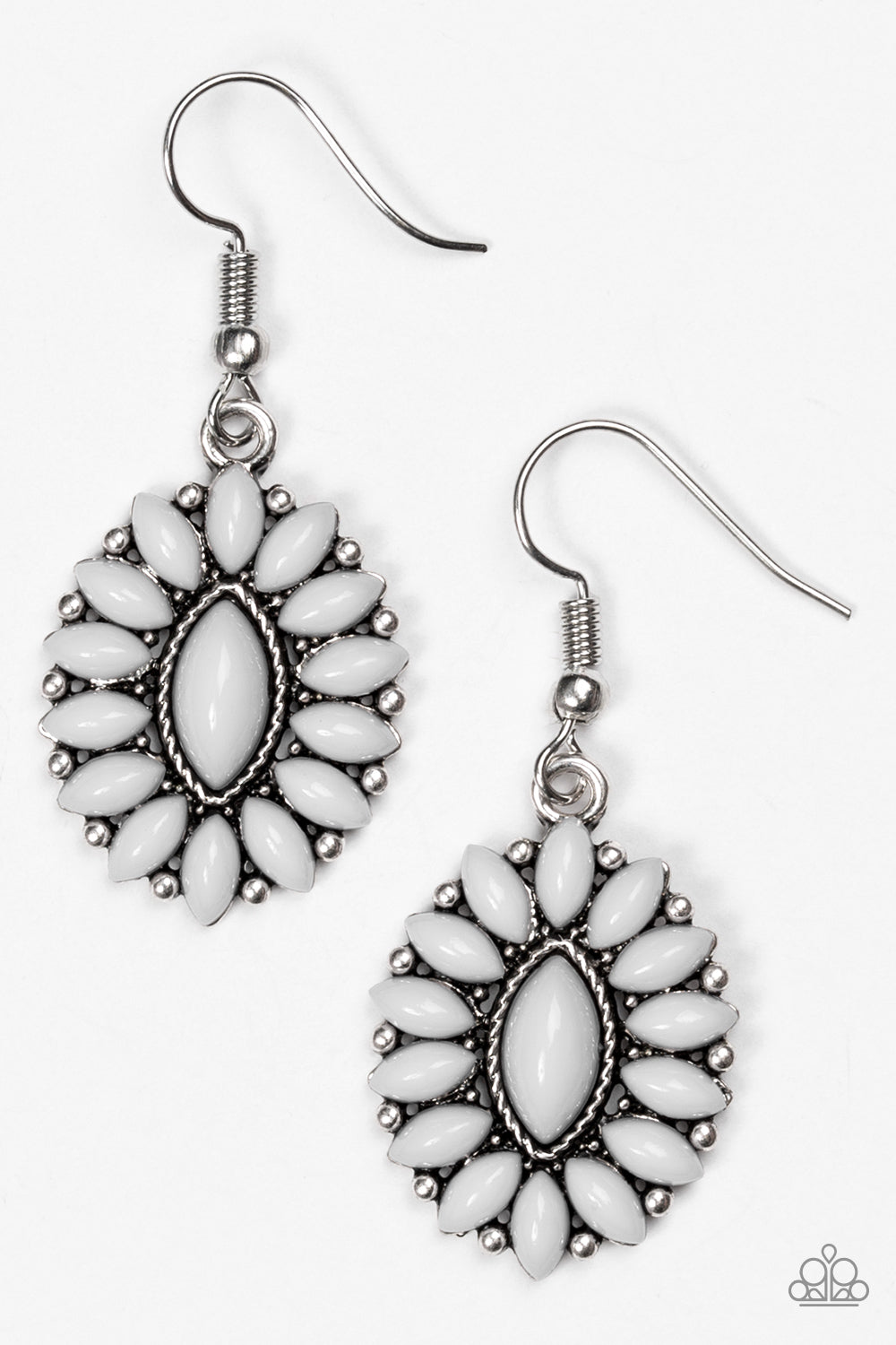 Gray marquise shaped beads are pressed into a shimmery silver frame, coalescing into a whimsical lure. Earring attaches to a standard fishhook fitting.