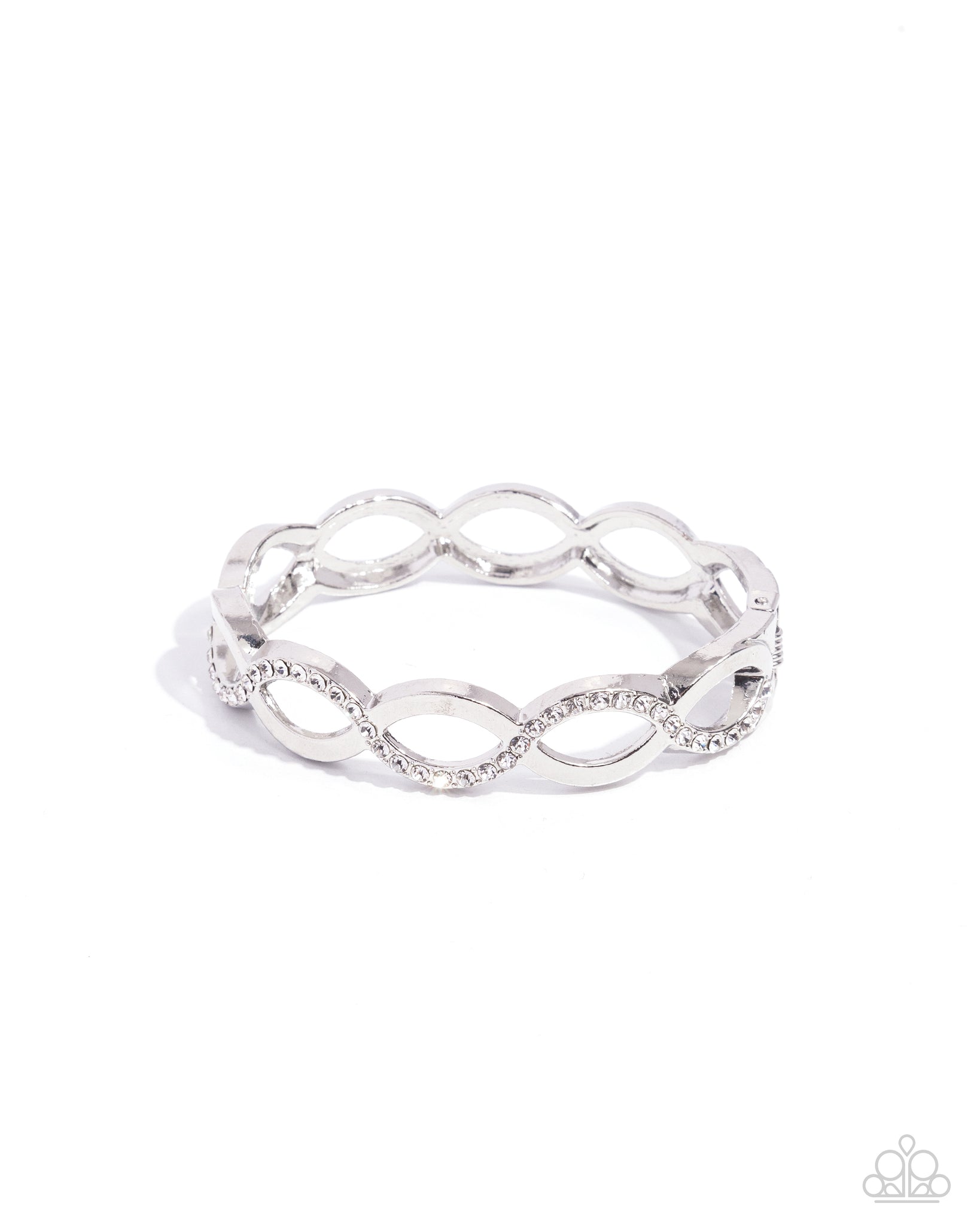 Silver bars elegantly intertwine into infinity inspired frames that delicately hinge around the wrist. The front of the flawless centerpiece is dusted in a wavy row of white rhinestones, adding a timeless twinkle to the versatile design. Features a hinged closure.