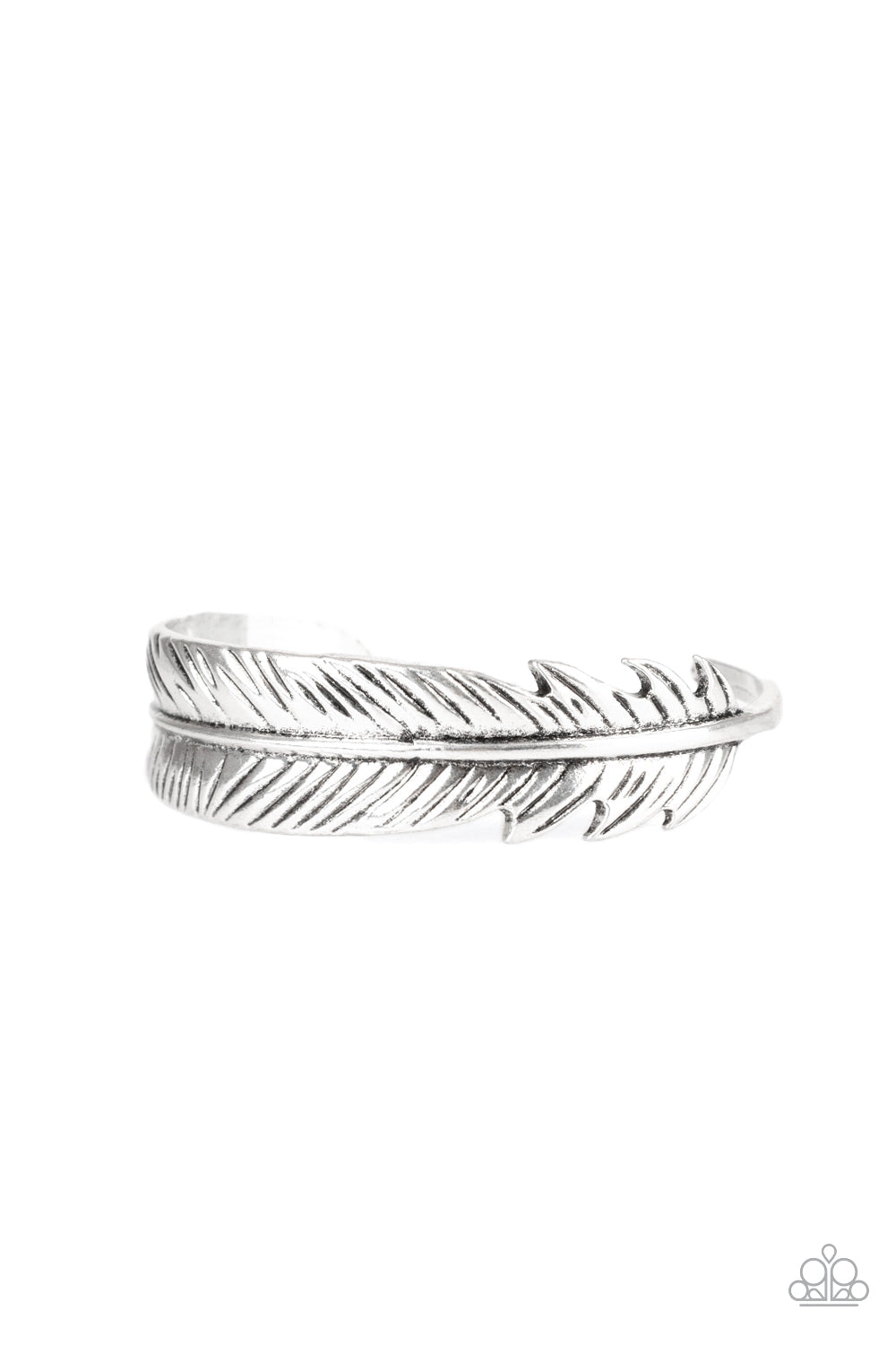 Brushed in an antiqued shimmer, a lifelike silver feather wraps around the wrist, creating a seasonal cuff.