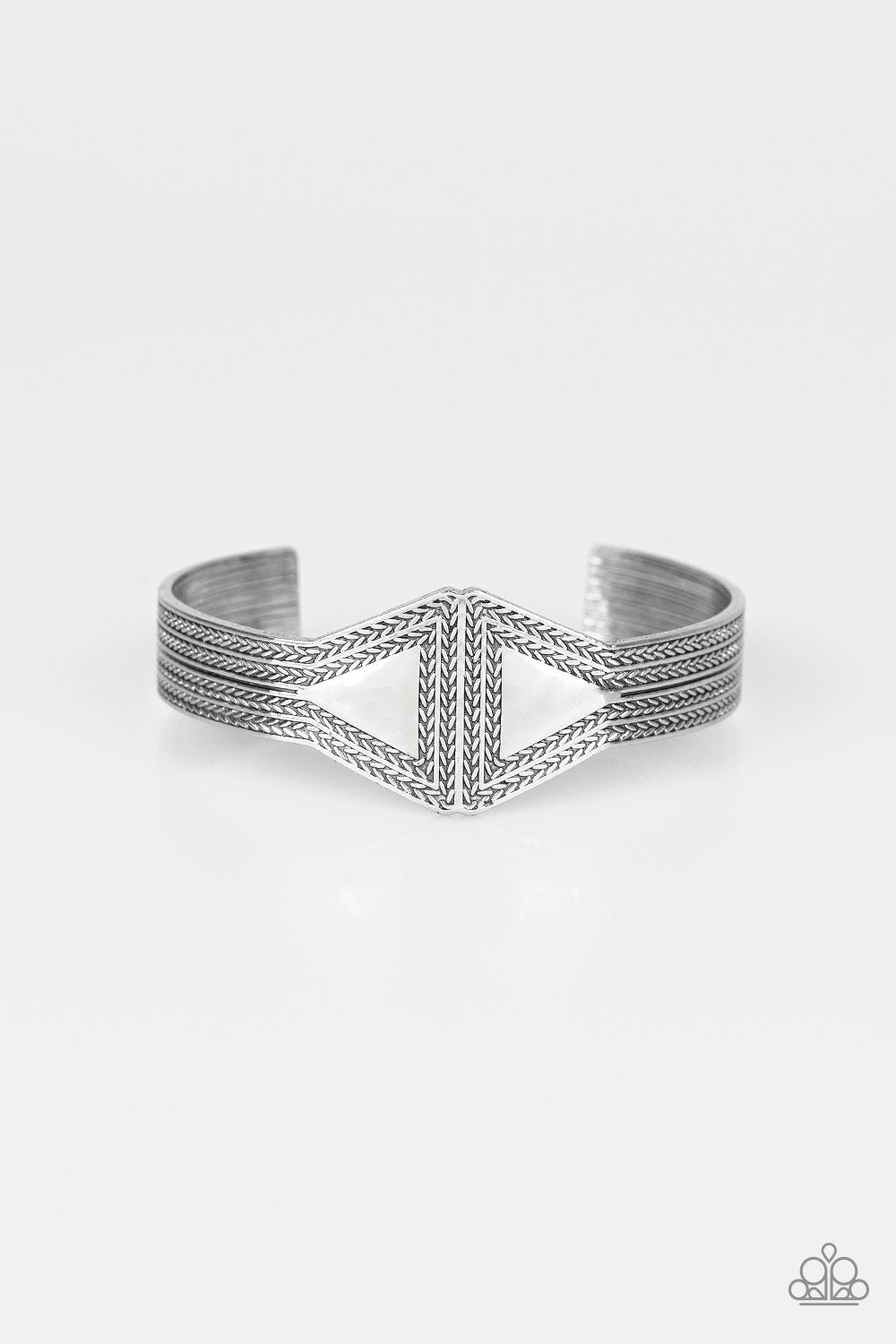 Embossed in tribal inspired patterns, a triangular silver cuff wraps around the wrist for a seasonal flair.