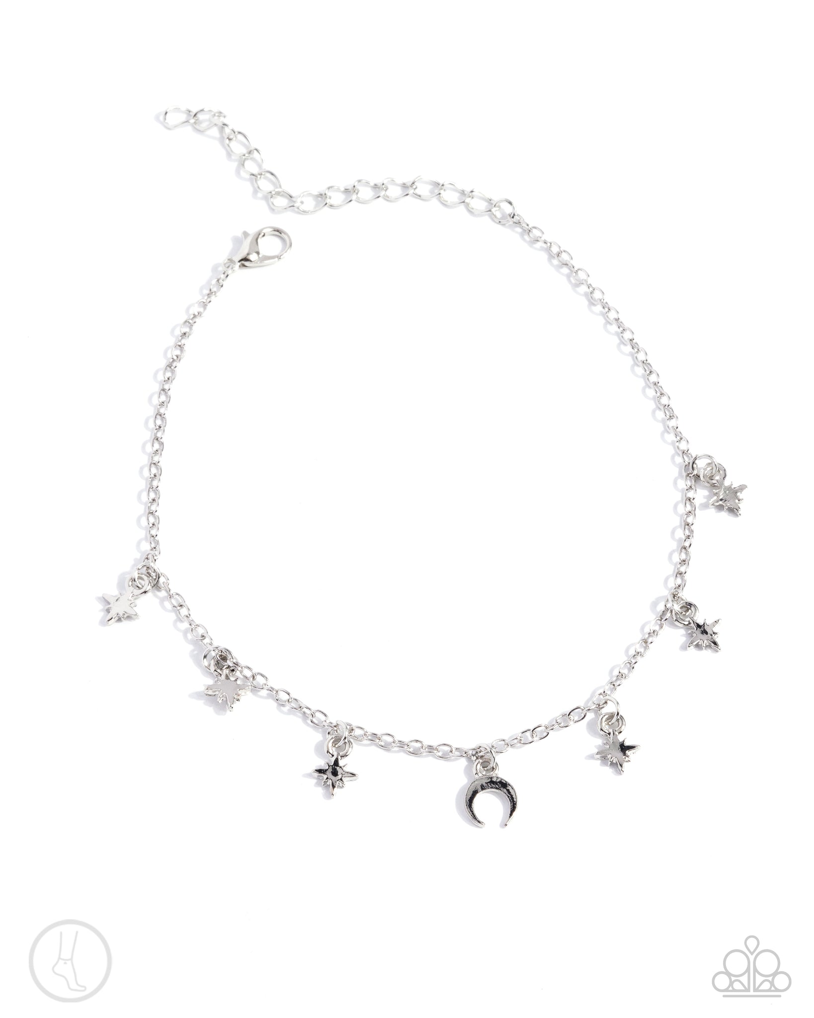 Swaying from a classic silver chain, a collection of dainty silver charms including three-dimensional stars and a tilted crescent moon coalesce around the ankle for a celestially chic display. Features an adjustable clasp closure.