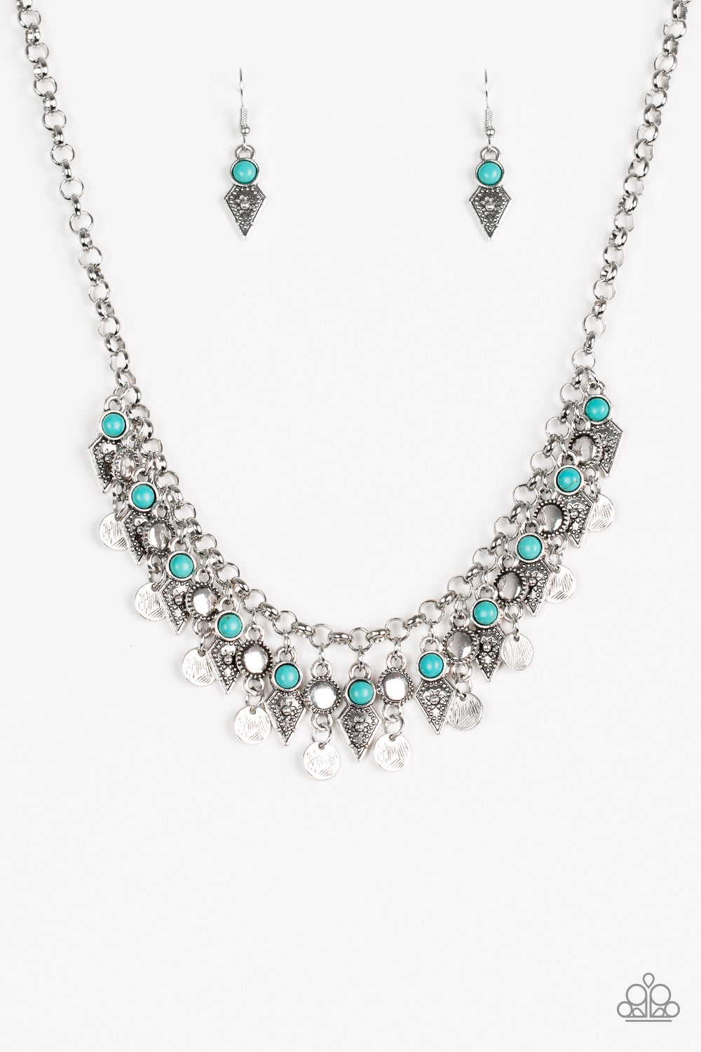 Featuring studded detail and refreshing turquoise stone accents, mismatched silver frames swing from the bottom of a bold silver chain, creating a flirty fringe below the collar. Features an adjustable clasp closure.