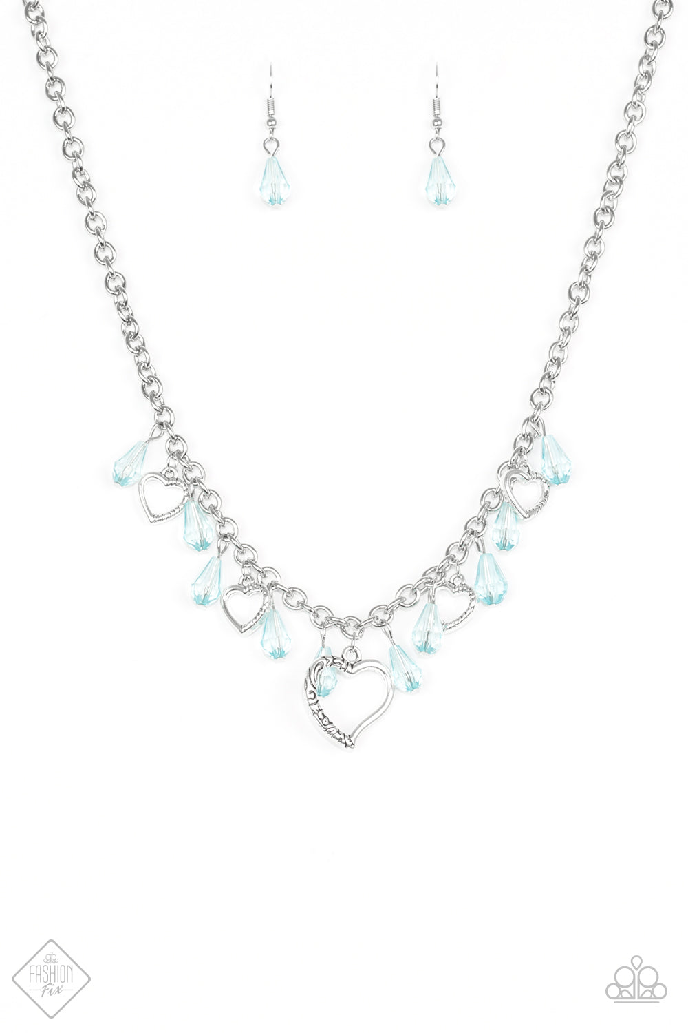 Crystal-like teardrops in the refreshing shade of Blue Radiance drip from the bottom of a shimmery silver chain. Stamped in ornate patterns, glistening silver heart silhouettes trickle between the colorful accents, creating a whimsical fringe below the collar. Features an adjustable clasp closure.