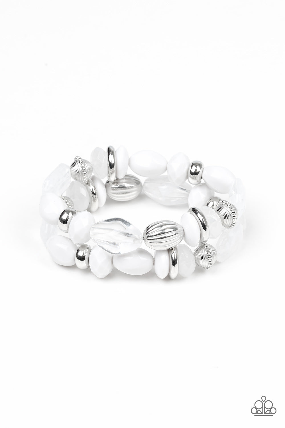 An assortment of opaque polished white and shimmery silver beads are threaded along stretchy bands around the wrist, creating colorful layers.
