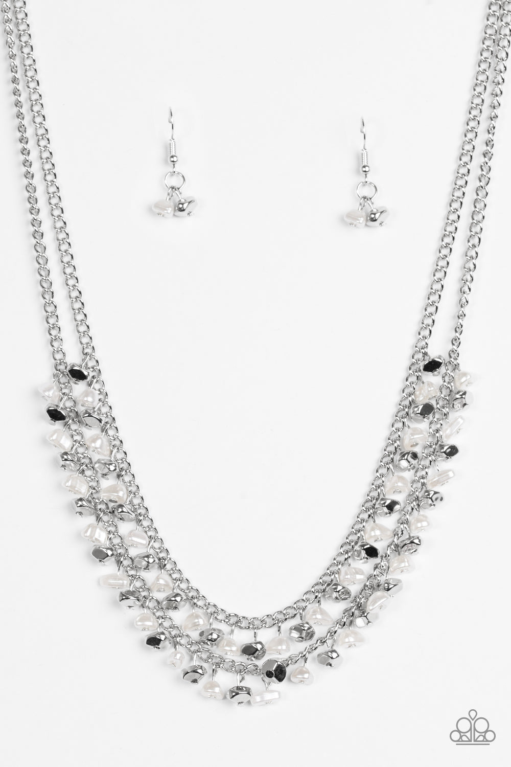 Faceted silver and pearly white beads swing from the bottom of two silver chains, creating a refined fringe below the collar. Features an adjustable clasp closure.