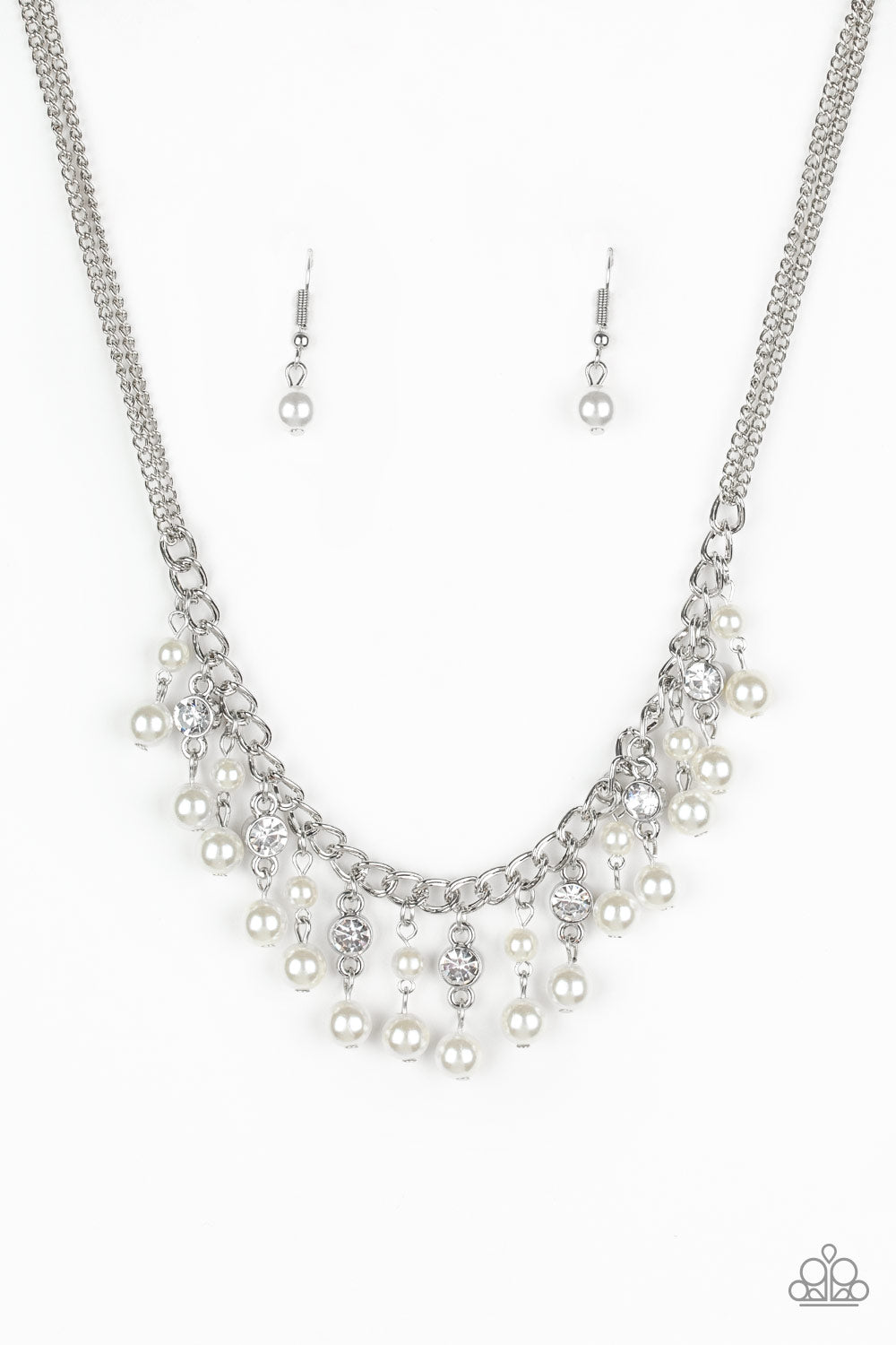 Alternating with glassy white rhinestones, pearly white beaded tassels swing from the bottom of a shimmery silver chain below the collar for a refined flair. Features an adjustable clasp closure.