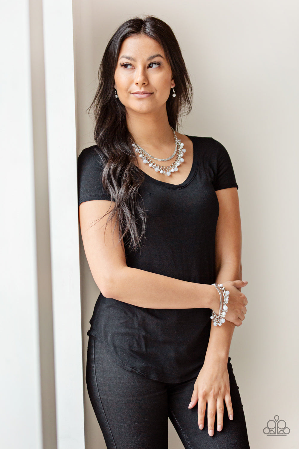 Infused with layers of mismatched silver chains, glassy, polished, white and glittery white rhinestones swing from the bottom of a bold silver chain, creating a bubbly fringe below the collar. Features an adjustable clasp closure.